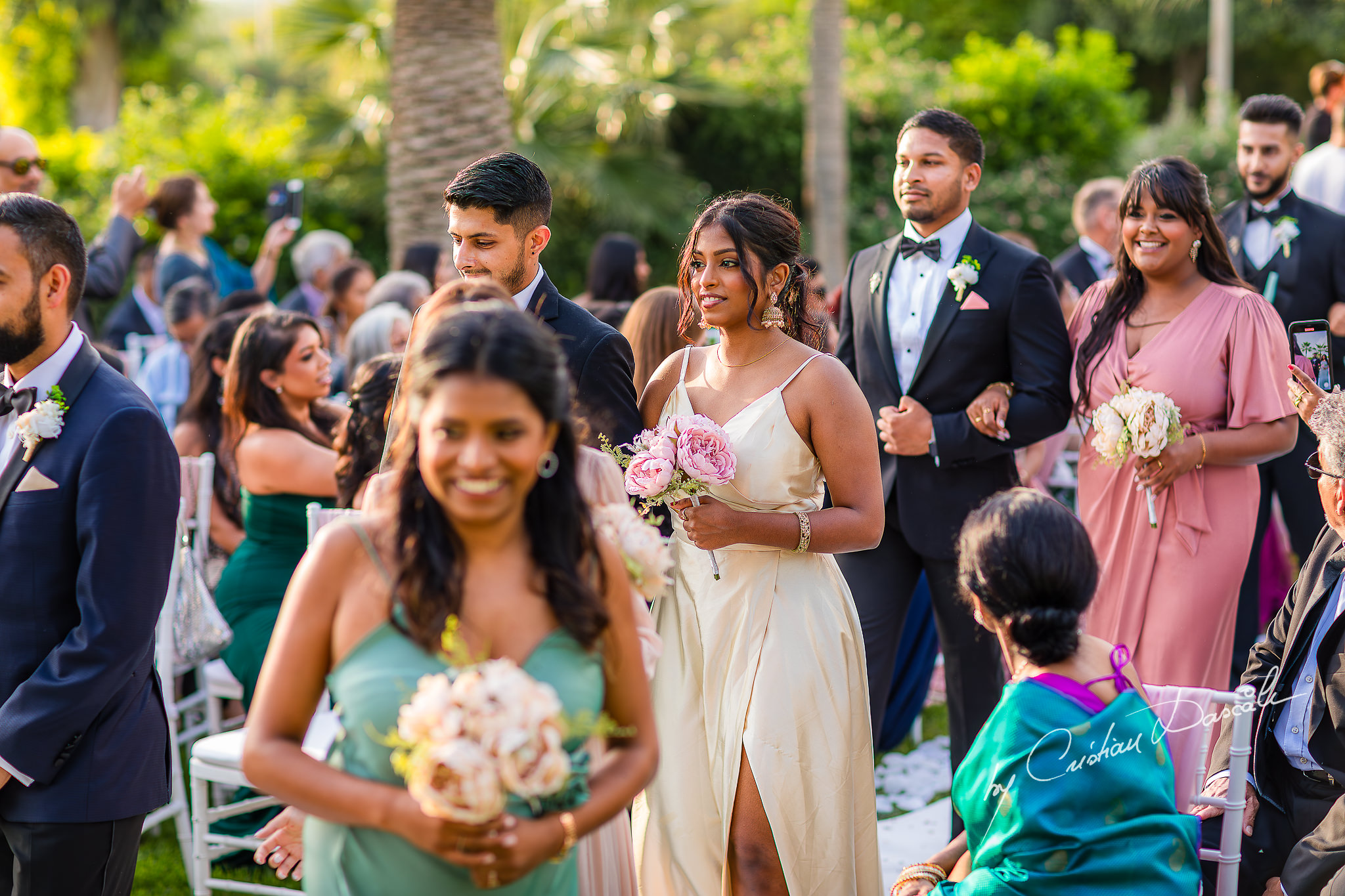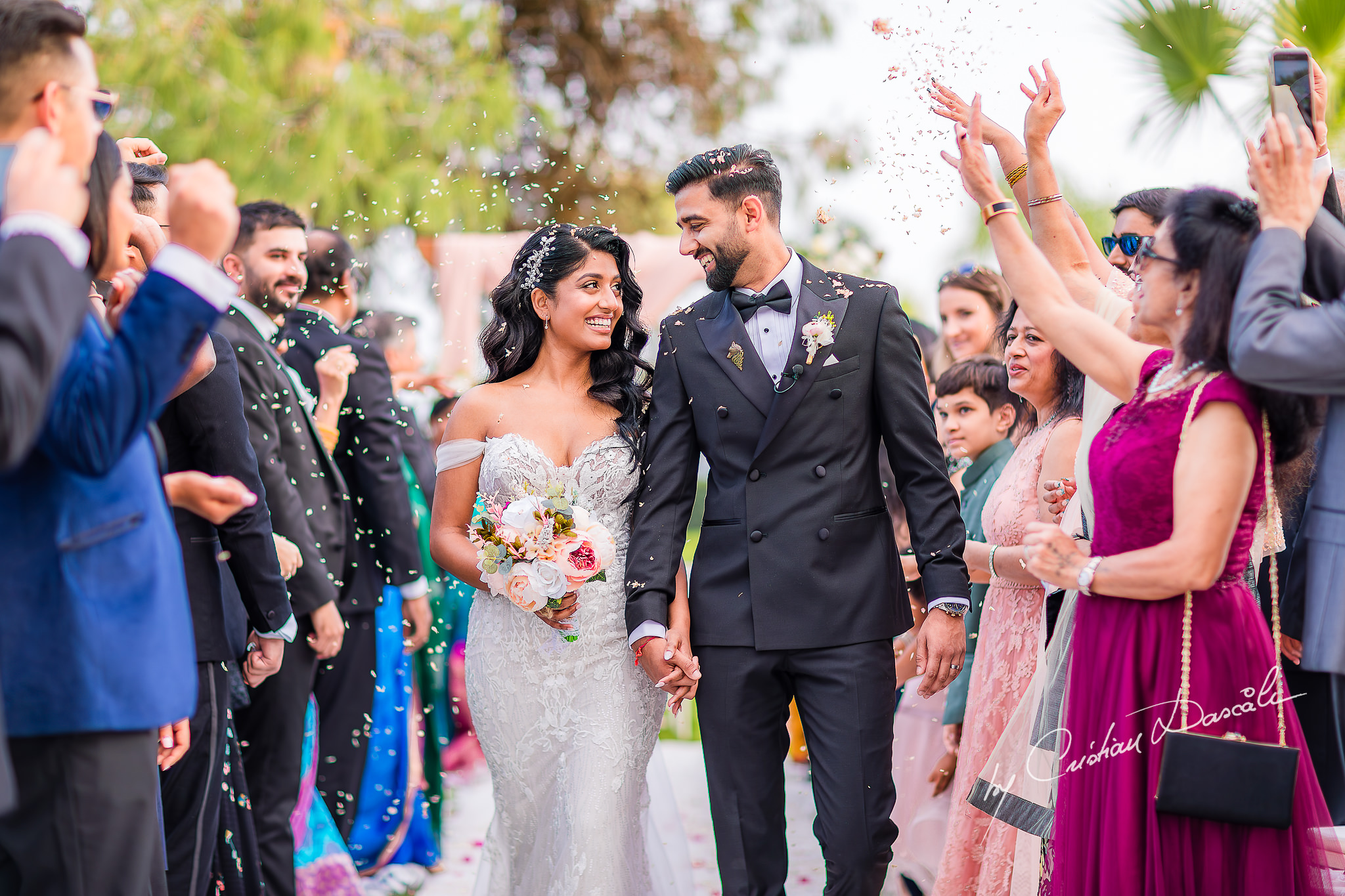 From the plans we had made when I joined Tara and Anish as their Indian wedding photographer in Limassol, I knew that today, they would walk down the aisle a second time to exchange rings and vows. This time, Anish donned a sleek modern suit, while Tara cast an angelic silhouette in her delicate white lace gown and long, trailing veil. Outside, in the verdant gardens of St. Raphael Hotel, soft notes of violin music carried on the wind, adding to the atmosphere of classical elegance.