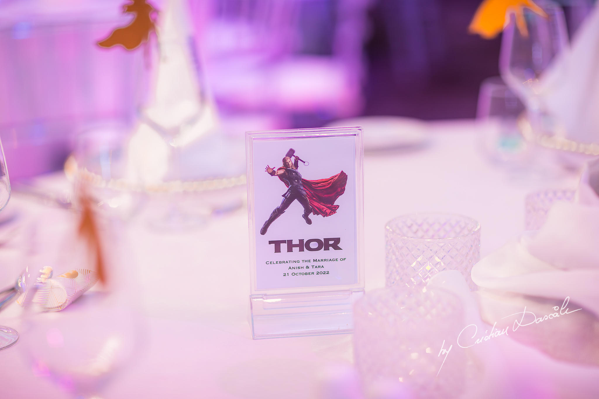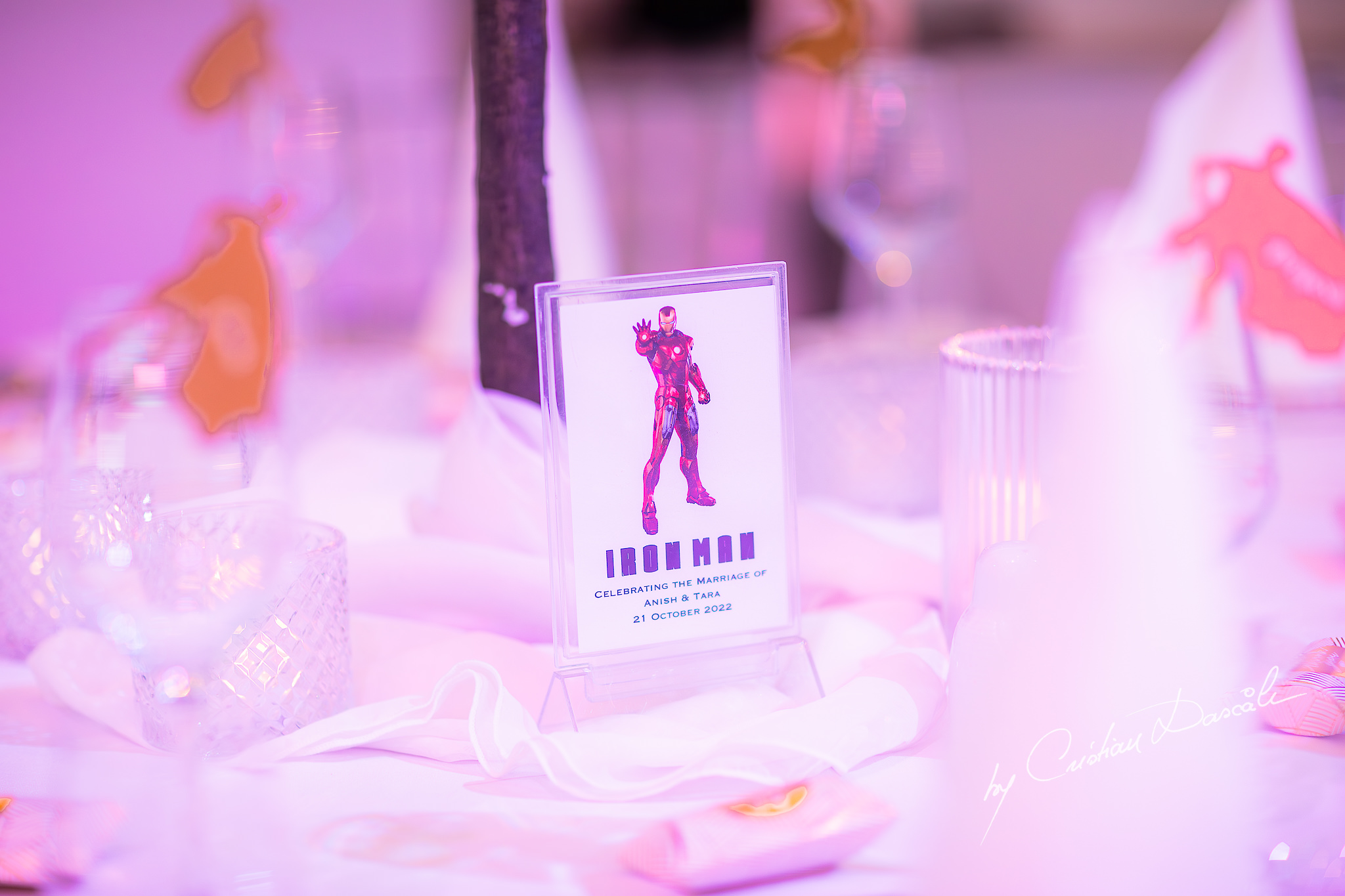 As the sky darkened and the ceremony drew to a close, Tara, Anish, and their families gathered together for the reception. To my delight, I was presented with something new in my career as an Indian wedding photographer in Limassol: A Marvel superhero-themed banquet lay before me, complete with unique decorations honouring the couple’s favourite characters. With murmurs of delight, the guests took their places and the cake was cut.