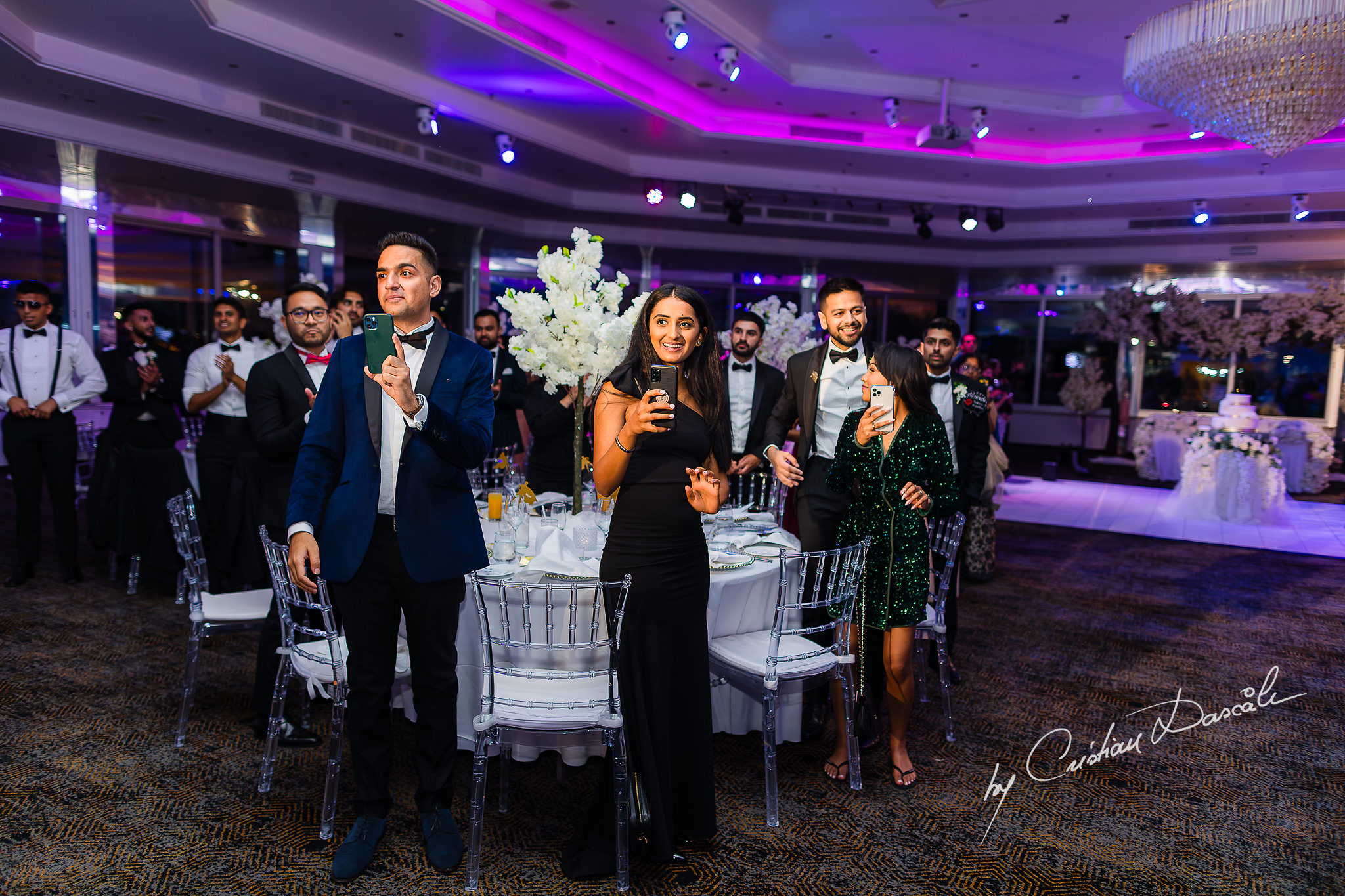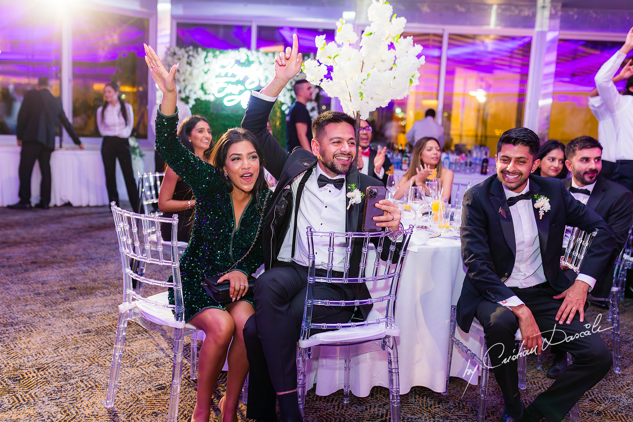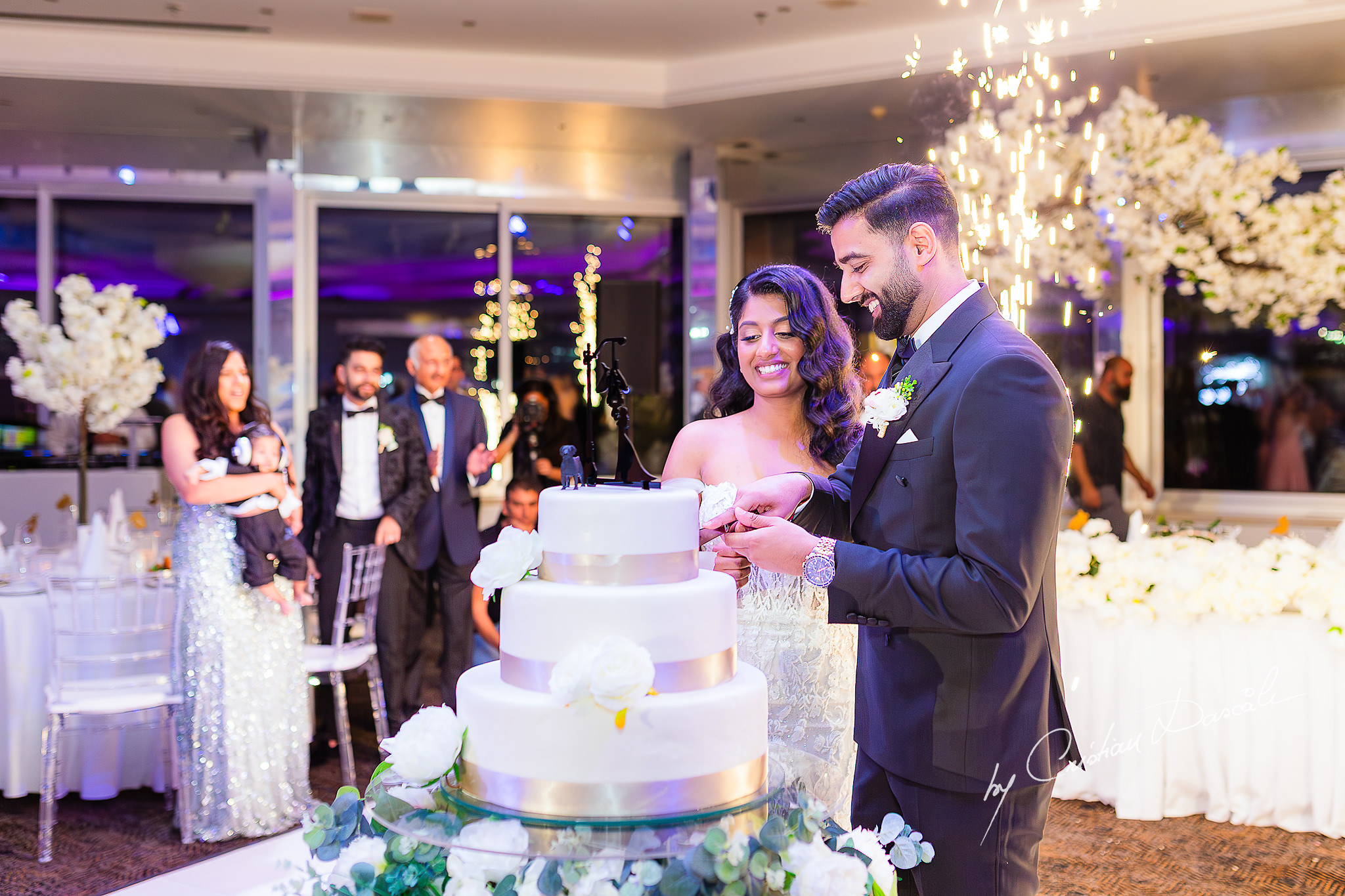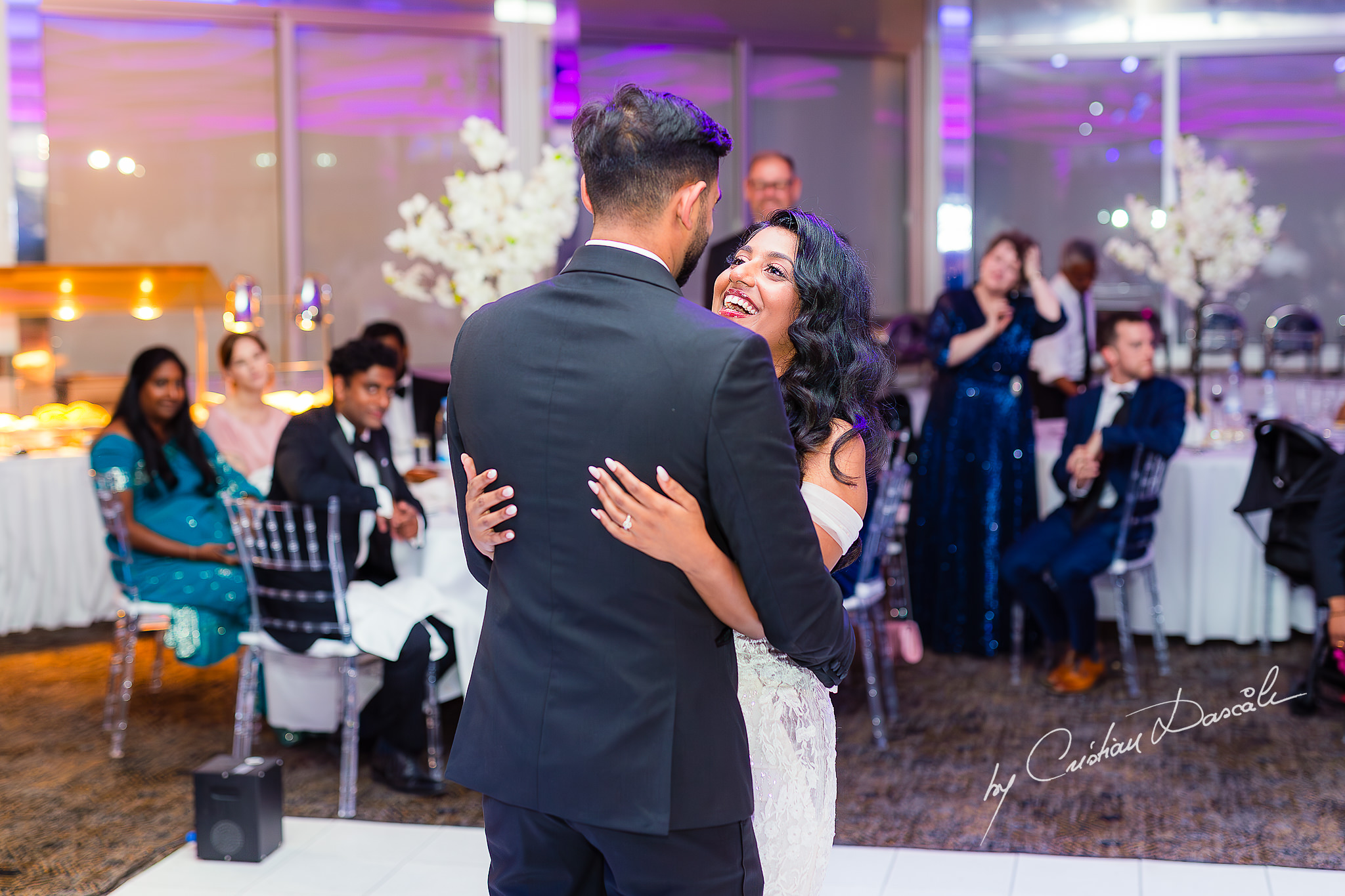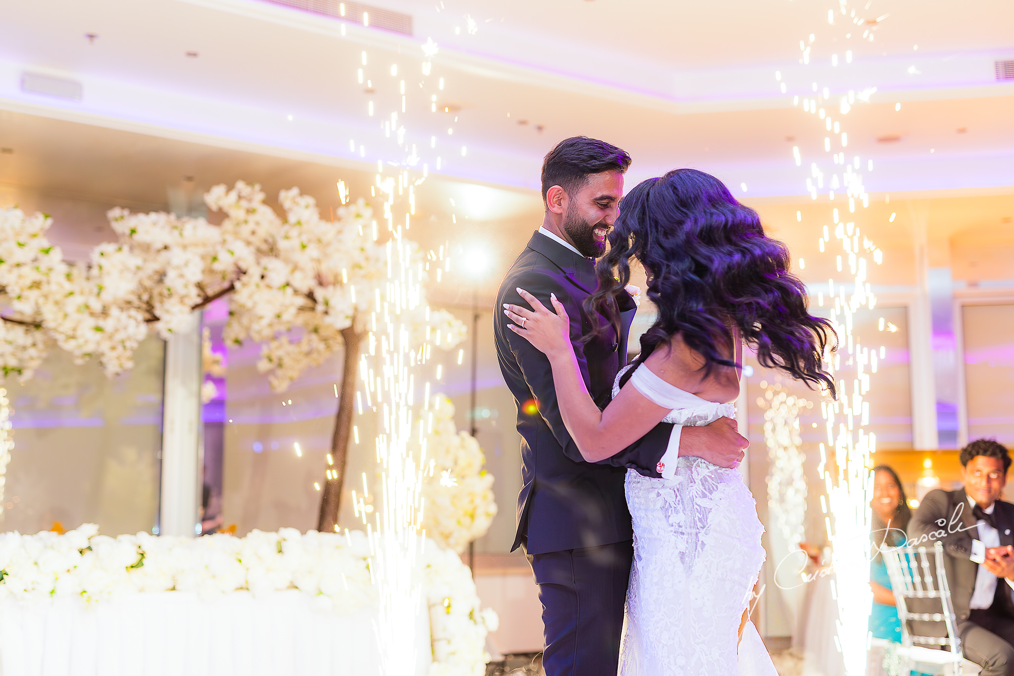 Soon, smiles lit the room around me as photos and stories were shared, weaving the tale of Tara and Anish’s union with jokes and laughter, cheers and sentiment. Then, as sparklers erupted with white-hot brilliance, the couple took their first dance together, ushering in the party. Holding each other tenderly, they reflected on the many moments of joy that had brought them here, to this elegant Indian symbolic wedding in Limassol.